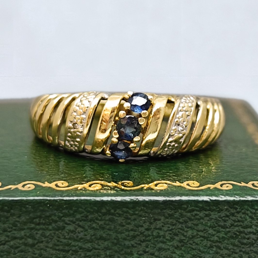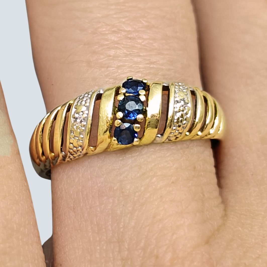 Ring i 14 kt. guld prydet med safirer og diamanter, der er fattet i hvidguld.