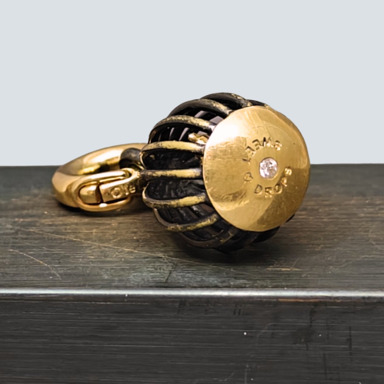 Ole Lynggaard; Sweet drop charm til at sætte på armbånd eller halskæder. i 18 kt. guld, med diamant i bunden. Fuglebur med lille guldfugl inden i. Buret med oxideret overflade. Kan åbnes i øsknet, så den også kan sættes på en perle- eller stenkæde.