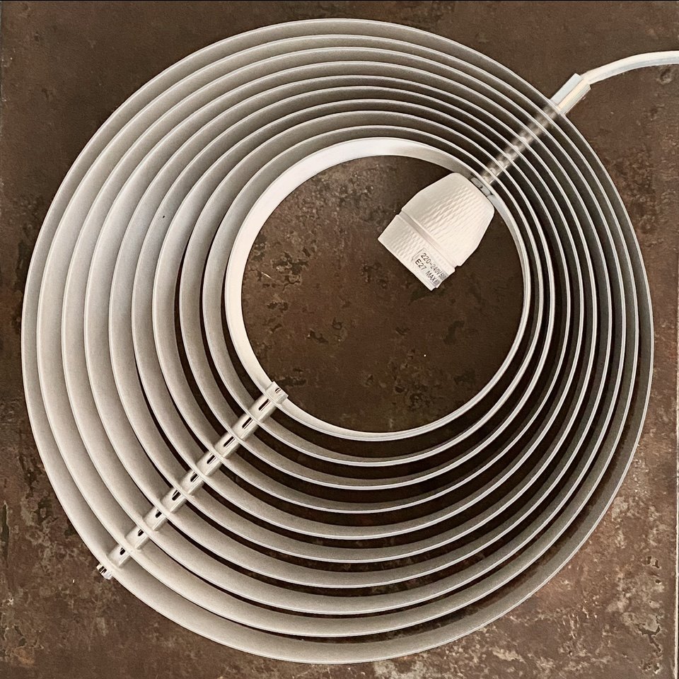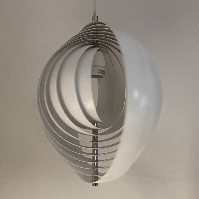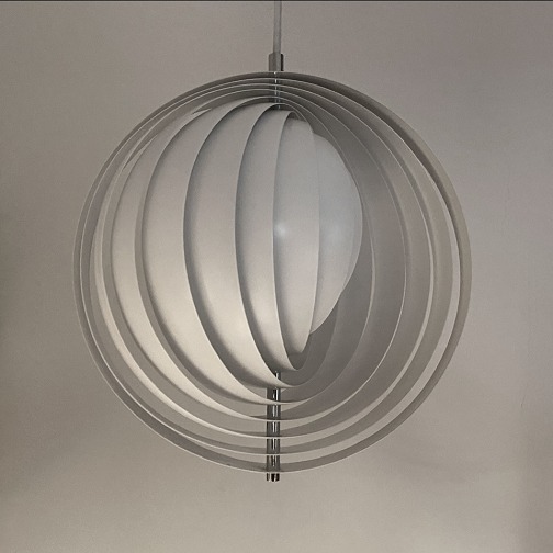 Verner Panton Pendel (The Moonlamp) udført af hvidlakeret metal. Formgivet i 1960, fremstillet hos Frandsen Lighting.