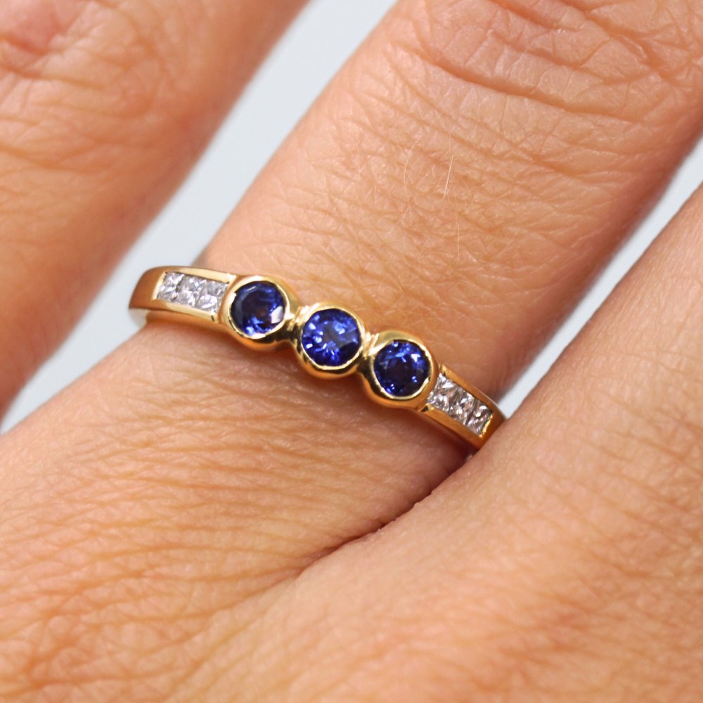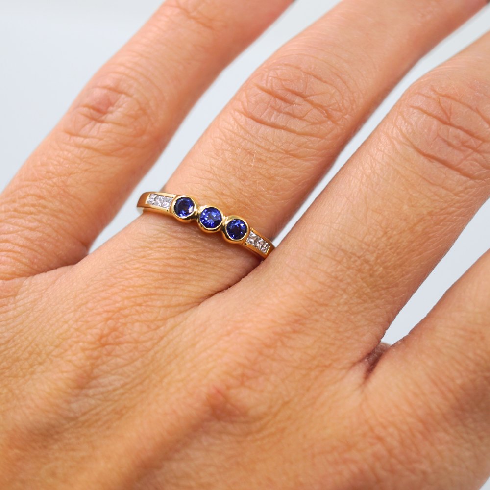 Ring i 18 kt. guld, prydet med tre safirer og seks diamanter, i alt 0.12 ct. Ring str. 50-51. Stemplet "750".