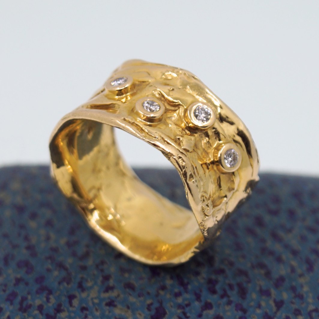 Henning Skovgaard; Bred ring i 14 kt. guld, prydet med fire diamanter, i alt 0.20 ct. Ring str. 53. Stemplet "585 GIG".